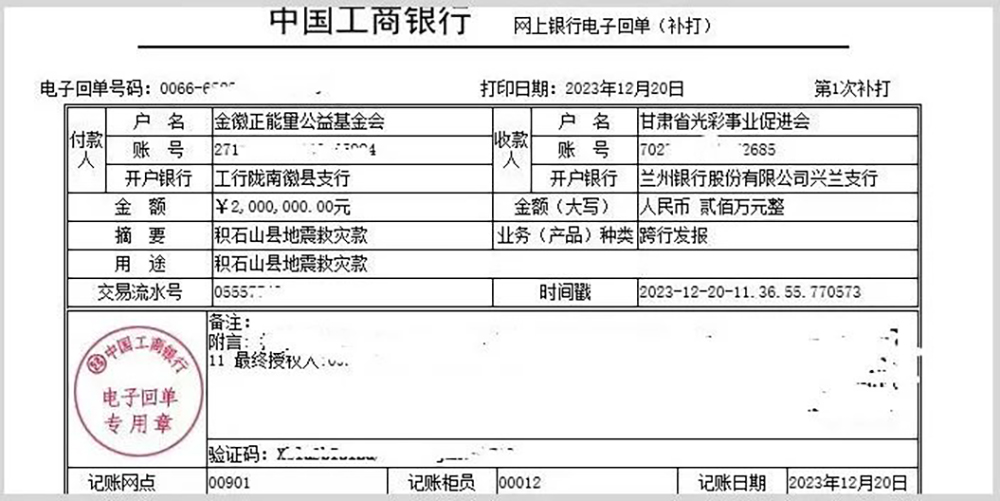 12月18日凌晨,6.2級(jí)地震突襲甘肅省臨夏州積石山縣,災(zāi)情牽動(dòng)著全國(guó)人民的心。金徽正能量公益基金會(huì)通過(guò)甘肅省光彩事業(yè)促進(jìn)會(huì)為積石山地震災(zāi)區(qū)捐款200萬(wàn)元,支持受災(zāi)地區(qū)緊急救援、受災(zāi)群眾安置和災(zāi)后恢復(fù)重建等工作。